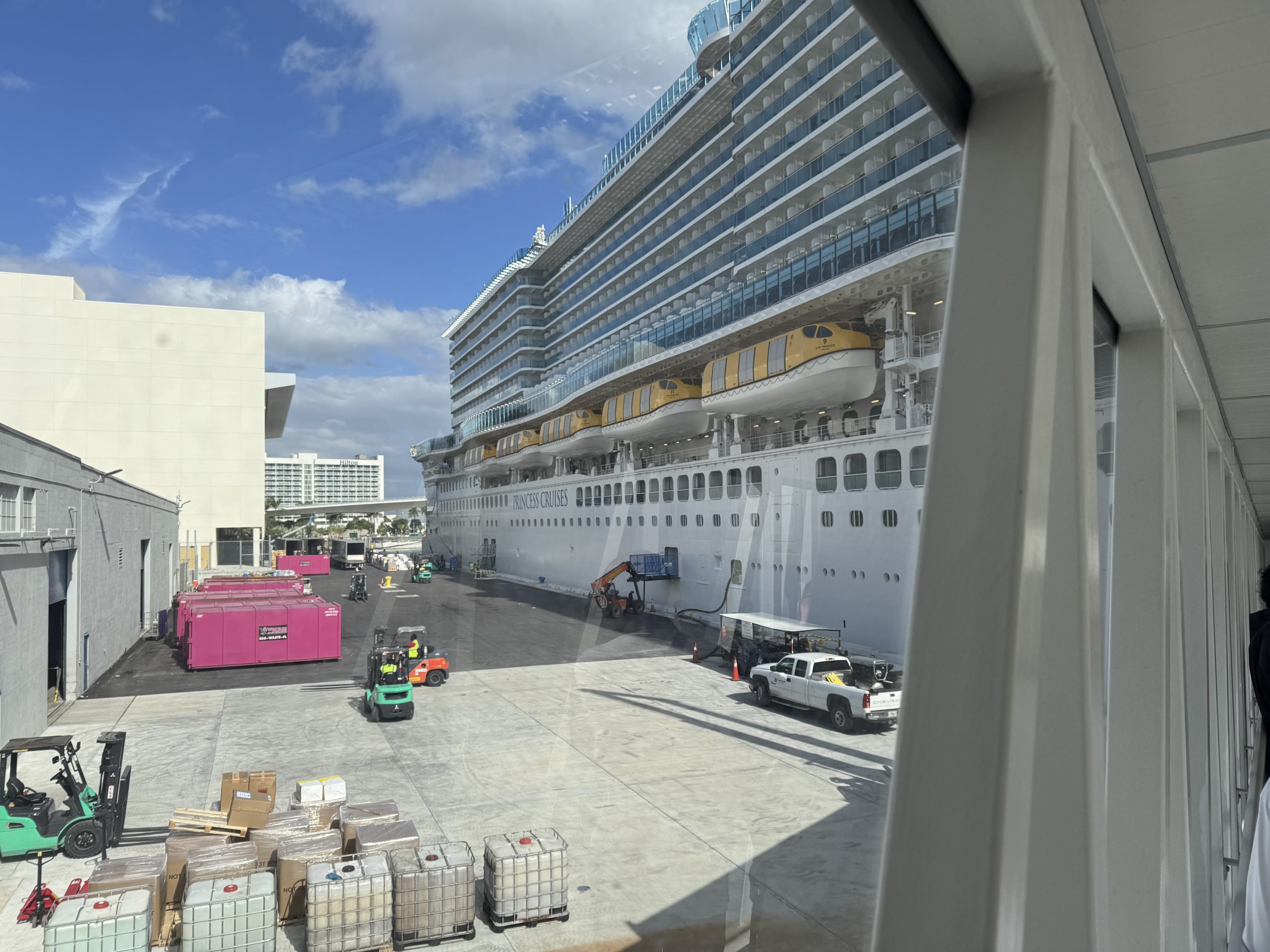 The ride over to Terminal 2 at Port Everglades had one additional stop at the Comfort Suites to pick up a few more passengers, and we were out of the vehicle and had transferred our luggage to a porter by 10:50am. From there on, it was another 10 minutes into the building and through security, and we made it through the Blue Lane and to the upstairs part of the terminal by 11:28. There was a slight delay on the boarding bridge, but in conclusion, we were on Sun Princess and in the Piazza by 11:40. No immediate problems with the Medallions either this time!