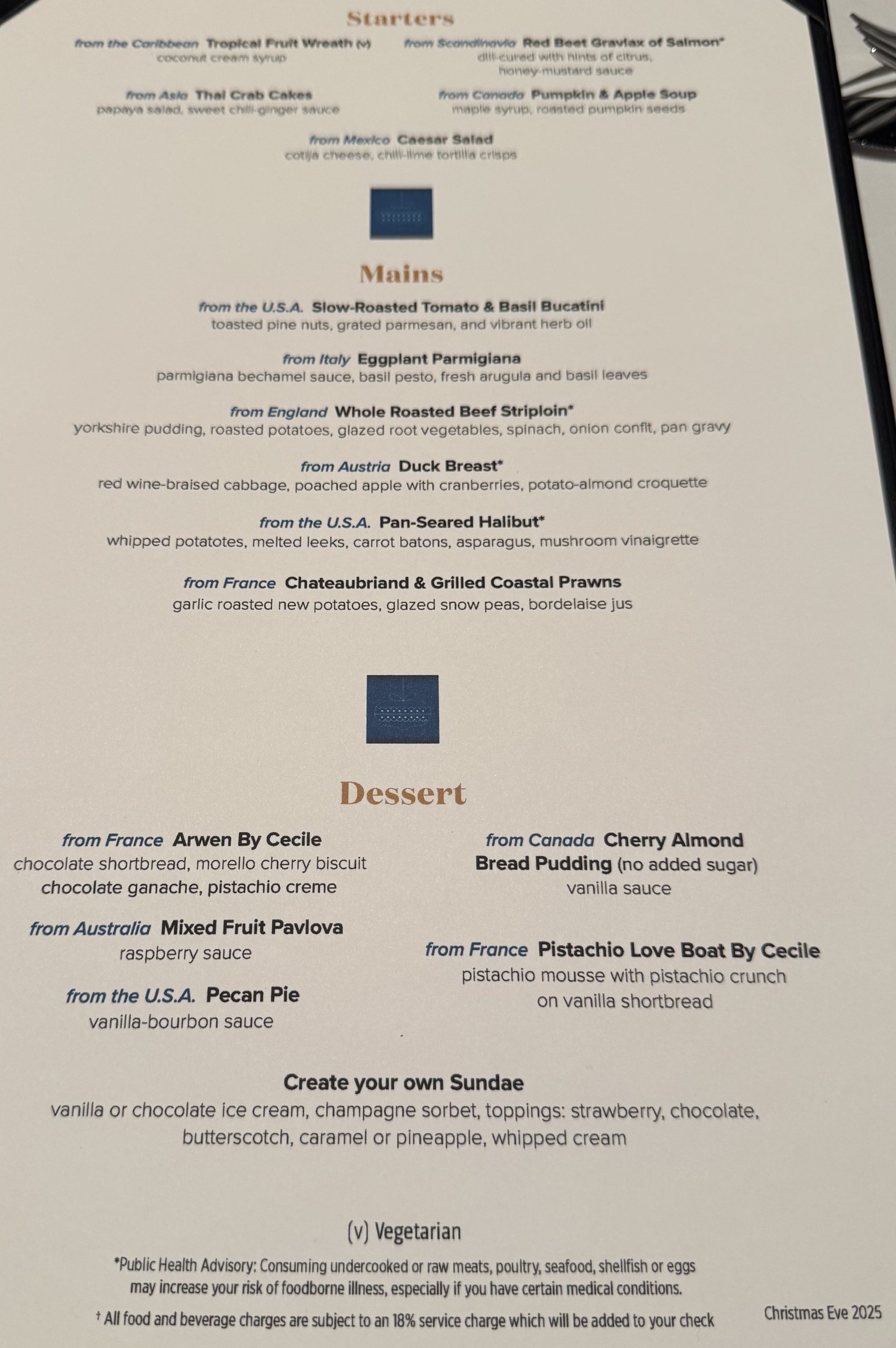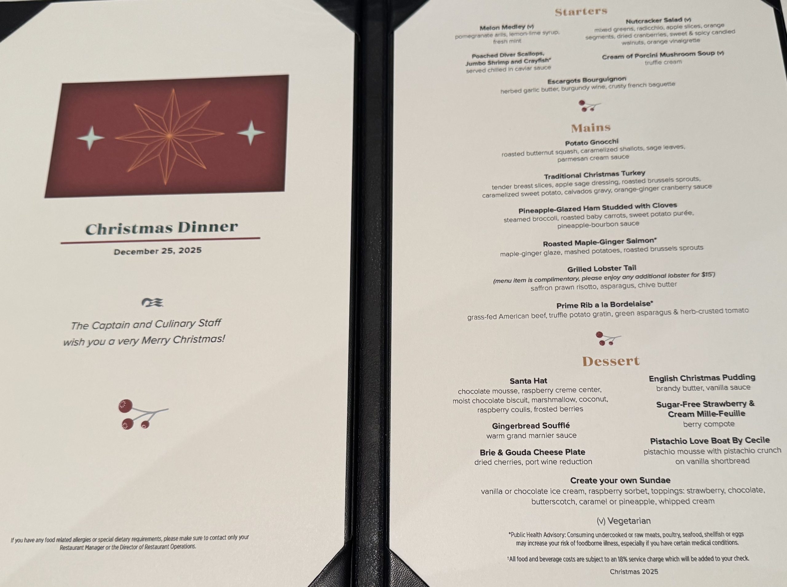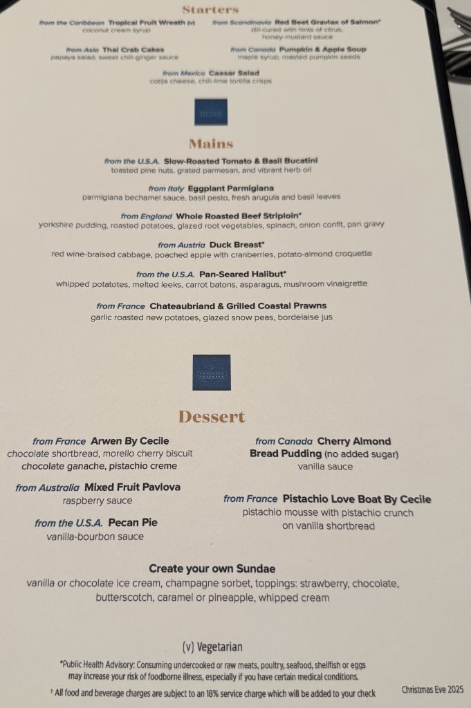 Christmas Day was a slightly lower key event than last year, with no videos on the giant screen in the Piazza showing Santa’s inbound flight, but it was better-timed and paced. One thing I really missed this year was Pint of Plain, who gave us some wonderful performances last December and in March, but unfortunately will not be able to perform as a trio going forward. Princess has decided to reduce the Irish performers on their ships from trios to duos at most, which I think is a poor tradeoff for what it might save financially, and certainly a loss for guests who enjoy the music and performance.