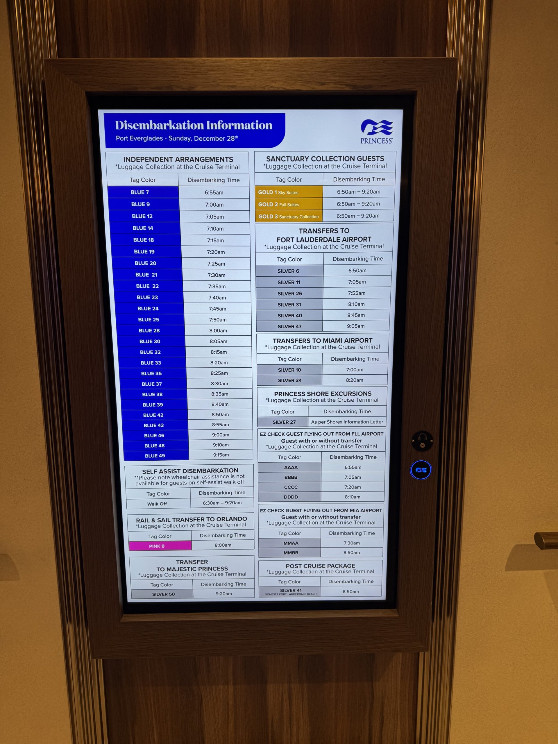 - We were asked to arrive at the Arena through Deck 7 at 9:30am the next day to proceed to customs/immigration in the terminal, then return to the ship once “zero count” was achieved. Existing Medallions would continue to work and become functional around 10am, with stateroom access expected by 10:30am.