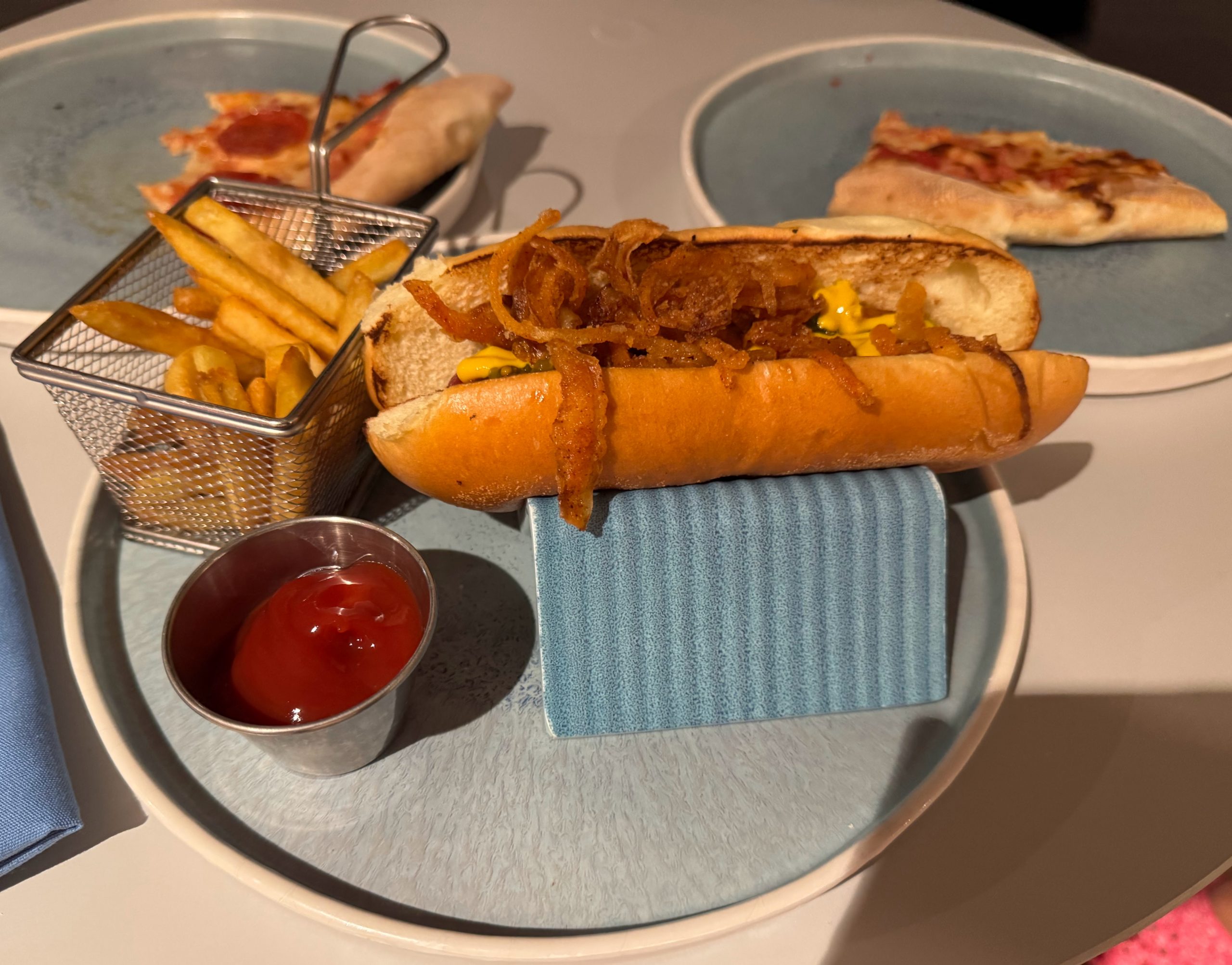 Our kids have now reached Platinum Captain’s Circle status, so were legitimately able to enter the daily Platinum and Elite Lounge area before dinner (good thing, because staff were checking Medallions.) On these sailings the “lounge” was in the back of the Americana Diner, with a small section of maybe 15 tables roped off and a portable, self-serve buffet. It’s less food variety than Enchanted Princess (no giardiniera – but that was available from the salad section in the Eatery), and drink service is slower as there’s no bar in the same area. No real complaints, but it’s not quite as good of an experience as the Vista Lounge. It still was a helpful place to stop for a few nibbles after the kids returned from the afternoon Firefly Park session.