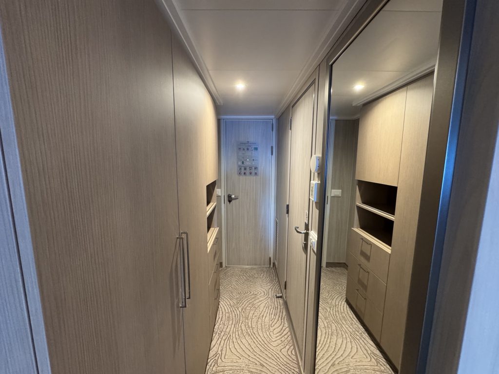 Standard mini-suites and higher-tier suites have a larger wardrobe by width, located in the centre of the room with plenty of space to have the drawers out and walk around it. Interestingly, cabana mini-suites have the smaller bathroom size and wardrobe near the entrance as a tradeoff for the extra area used by the cabana portion of the room, so keep that in mind if booking this type of room.