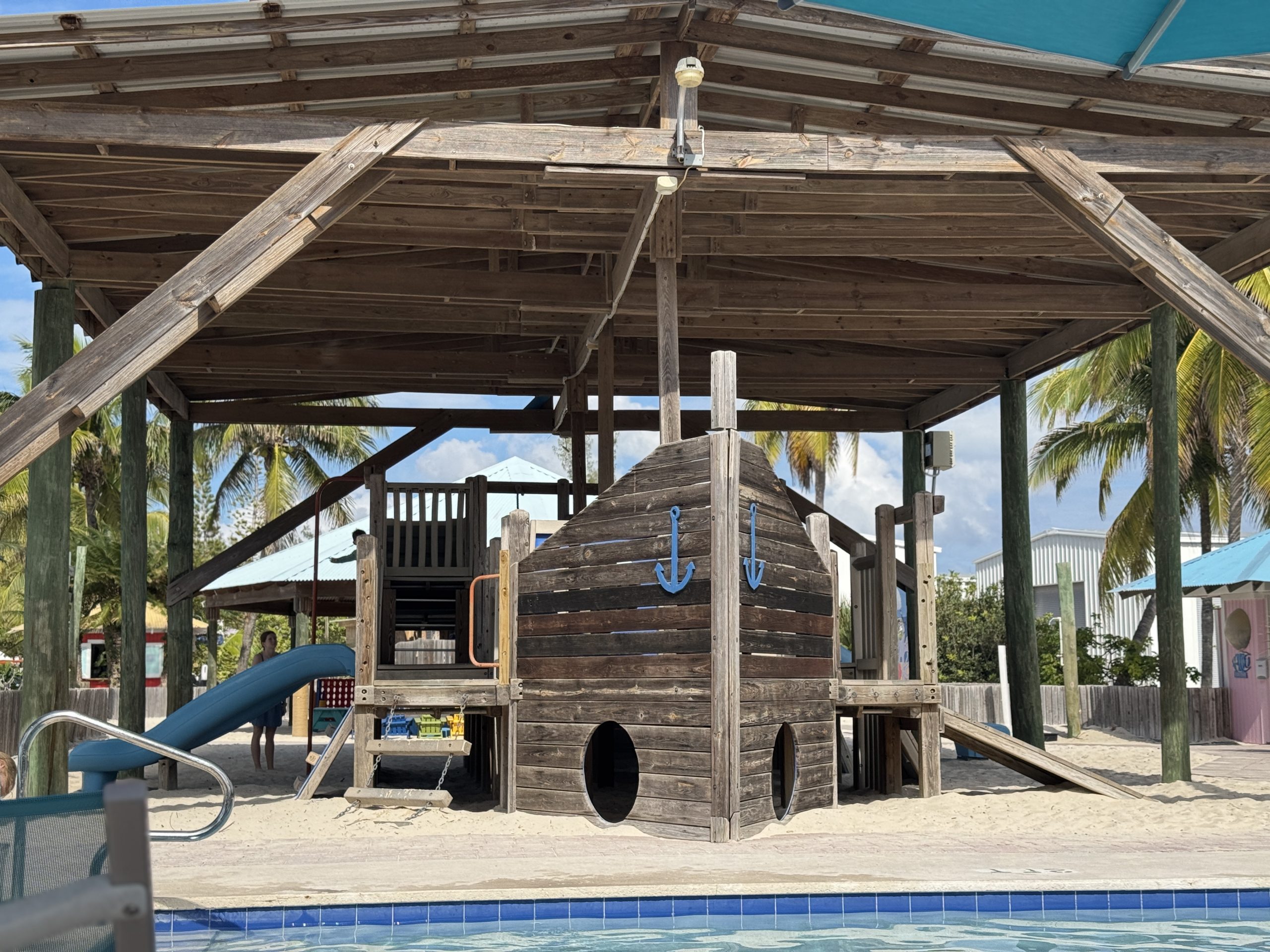 There were a few extra nice features on Princess Cays for families. There’s a shaded parent and tot area, a playground, and a shallow pool with lifeguard designated for kids 12 and under. One downside is that the lifeguard on our visit was primed with a whistle in mouth, ready to blast it at any kid who didn’t rinse off their feet or started messing around in the pool. Our kids were worried that they’d get chirped even when behaving well, and when other kids didn’t follow the rules, the noise upset them.