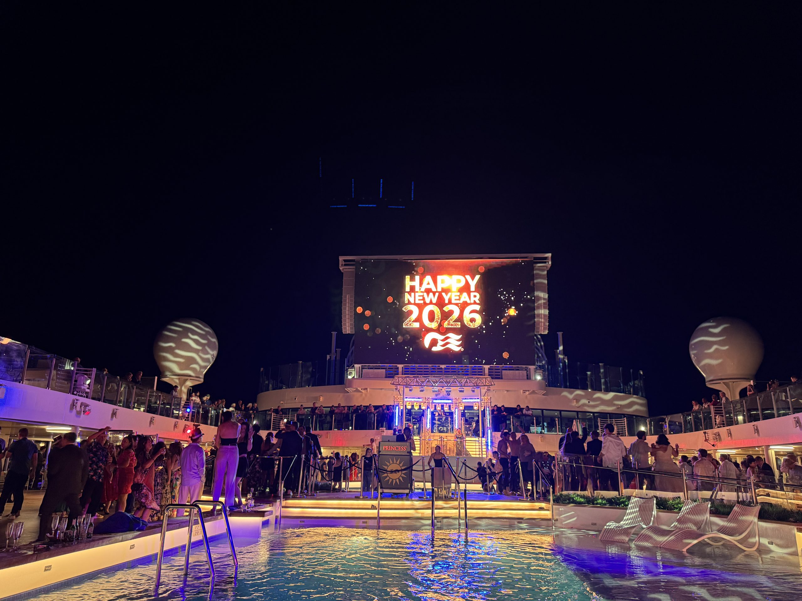 Somewhat begrudgingly, I admit that New Year’s Eve was good. I can’t say that it was worth the price difference for the week on its own, but I look back at it as a wonderful evening. They had several venues in use around the ship, ranging from formal-dress-required in Princess Live to the live band and DJ up on the pool deck. The pool area is where we spent our evening with very convenient access to pizza, hot dogs, and ice cream. Drink service was slammed but politeness with the roving servers went a long way. There’s a tradition where many people jump in the pool in their full outfit at midnight, and our children were absolutely thrilled to be able to participate.