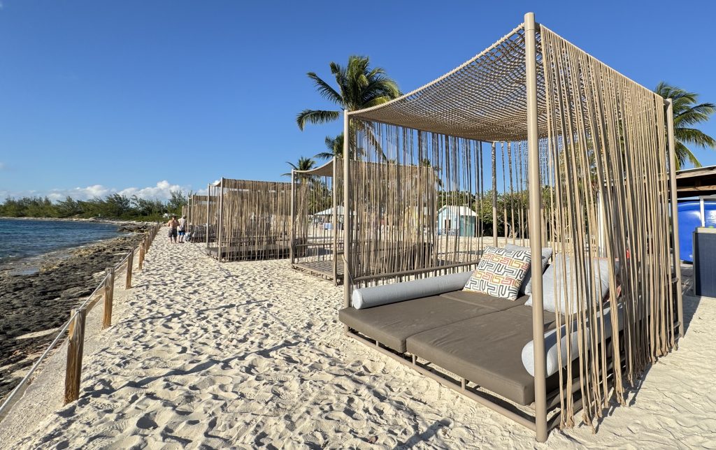 Daybeds also don’t include any additional perks like drink or food service, or water equipment like floats. If you can handle a beach chair for your backside and don’t need the extra space or mind being lower to the ground, a clamshell rental at a third of the price may be a better option. You’ll have a better shade opportunity and would be closer to the beach and water. We liked the daybed and I got a lovely nap in, but I think I’d feel differently if it was purely out of pocket – this “excursion” was what we spent our non-refundable onboard credit on.